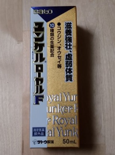 一般的に、飲んですぐ元気になるやつって、『残り少ない元気を、最後に無理やり勢いよく燃やす』ってイメージない?それに対してユンケルローヤルFは体が元気を作るための環境を整えてくれてる感じなのかな?生薬主体で。